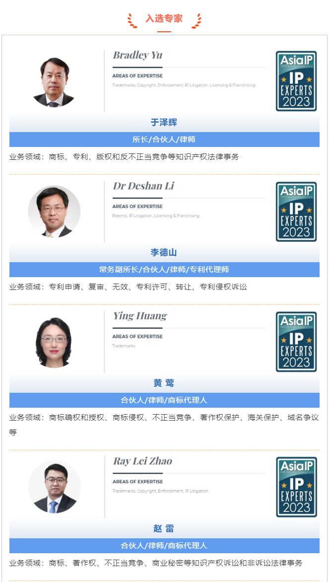 >竞彩网>关于我们>荣誉概览>2024>集佳5位合伙人入选Asia IP 2023年度“中国知识产权专家百强榜”