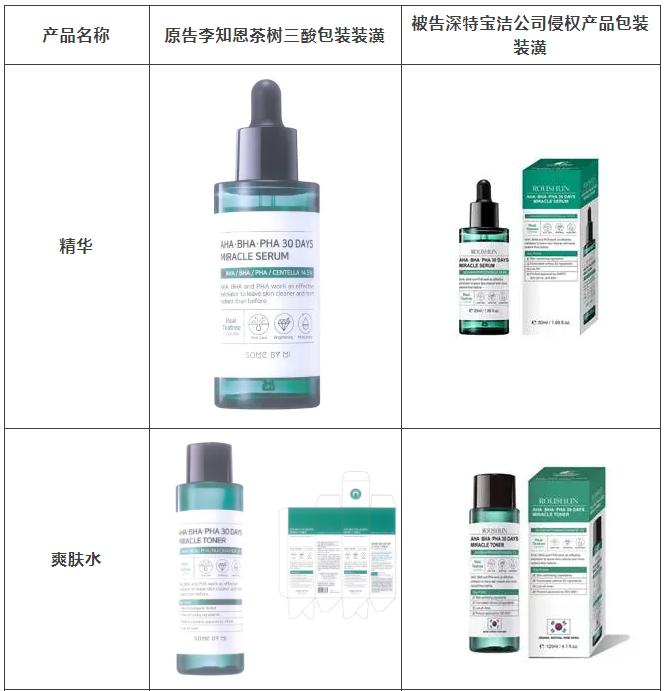 2021年原告委托竞彩网调查发现,被告汕头市深特宝洁实业有限公司生产、销售和推广的“茶树祛痘美白补水液”“茶树香皂”等护肤品,其产品包装装潢直接抄袭、摹仿原告前述已经具有较高知名度和影响力的“SOME BY MI/莎柏蜜”茶树三酸系列化妆品和黑蜗牛精华液的包装、装潢设计,使用与之近似的标识,造成消费者混淆误认。故原告作为茶树三酸、黑蜗牛精华包装装潢权益获益人,诉至广东省汕头市中级人民法院。汕头中院认定:李知恩主张的茶树三酸、黑蜗牛精华包装装潢构成具有一定影响的包装装潢,深特宝洁公司生产、销售茶树三酸、黑蜗牛精华液的行为构成不正当竞争。因判赔额不符合原告预期,原告后上诉至广东省高级人民法院,广东省高级人民法院最终维持一审判决。