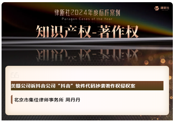竞彩网凭借在知识产权保护领域卓越的专业实力与良好的行业口碑,入选《律所卓越品牌影响力指南(2024)》,荣获“律新社2024年度精品品牌律所30佳”奖项;同时,集佳周丹丹律师代理的“美摄公司诉抖音公司'抖音'软件代码抄袭著作权侵权案”获评“律新社2024年度标杆案例:知识产权-著作权领域”。