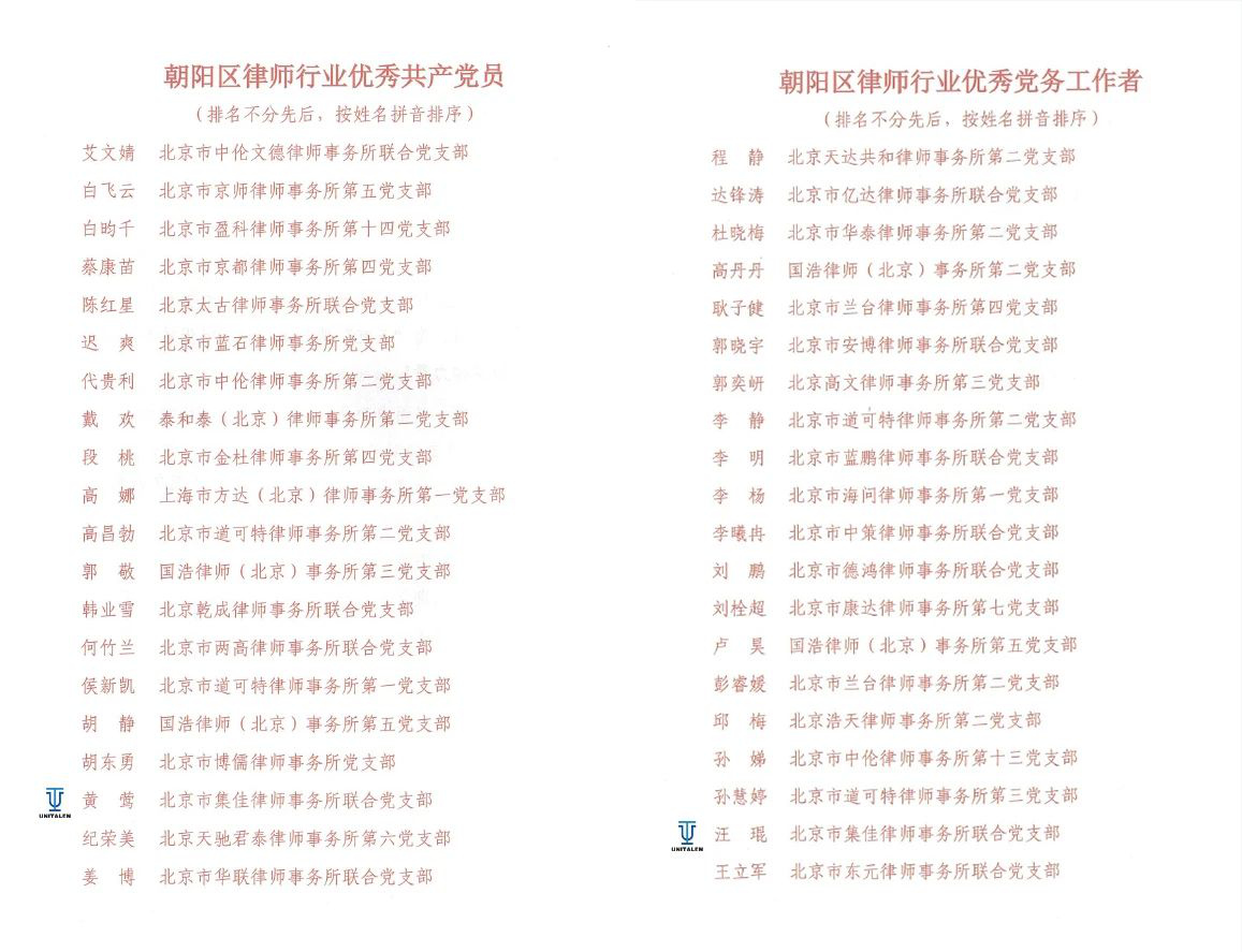 6月27日,朝阳区律师行业党委召开了朝阳区律师行业庆祝中国共产党成立104周年暨总结表彰大会,竞彩网联合党支部党员黄莺荣获“朝阳区律师行业优秀共产党员”称号,支部党员汪琨荣获“朝阳区律师行业优秀党务工作者”称号。