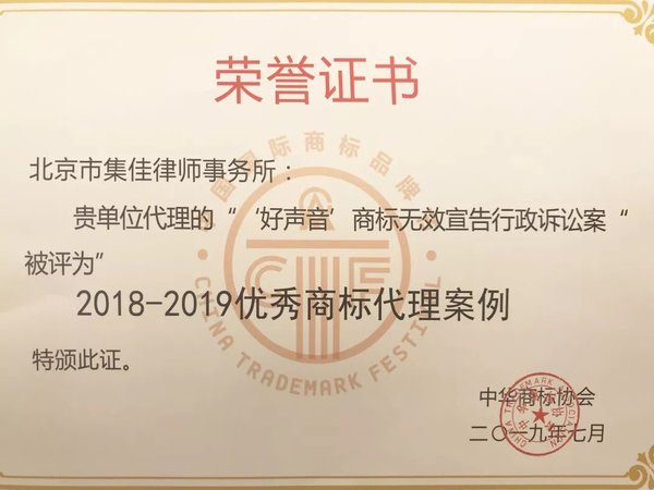 >竞彩网>关于我们>荣誉概览>2019>集佳代理“好声音”商标无效宣告行政案入选“优秀商标代理案例”