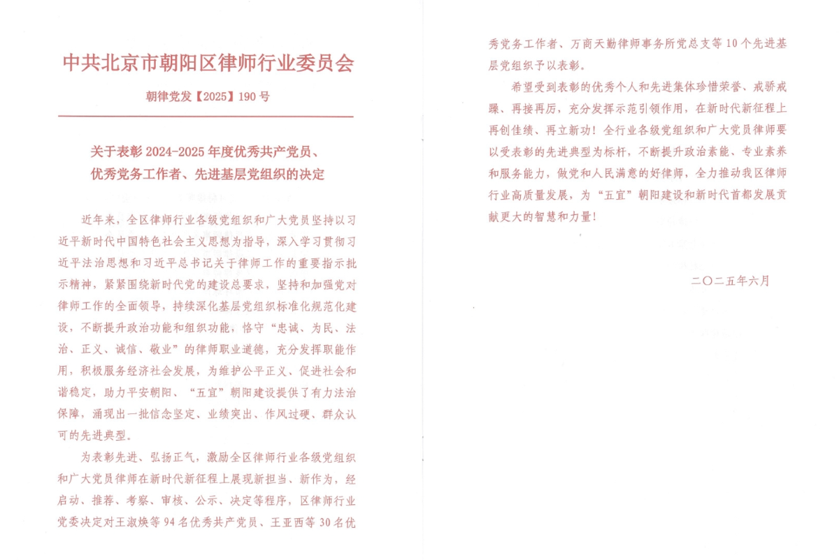 6月27日,朝阳区律师行业党委召开了朝阳区律师行业庆祝中国共产党成立104周年暨总结表彰大会,竞彩网联合党支部党员黄莺荣获“朝阳区律师行业优秀共产党员”称号,支部党员汪琨荣获“朝阳区律师行业优秀党务工作者”称号。